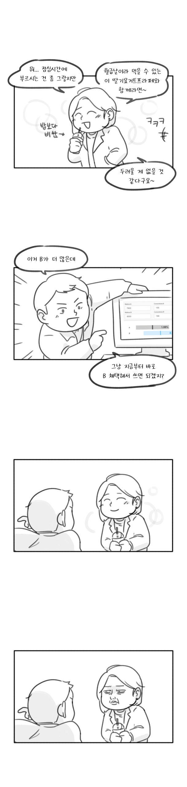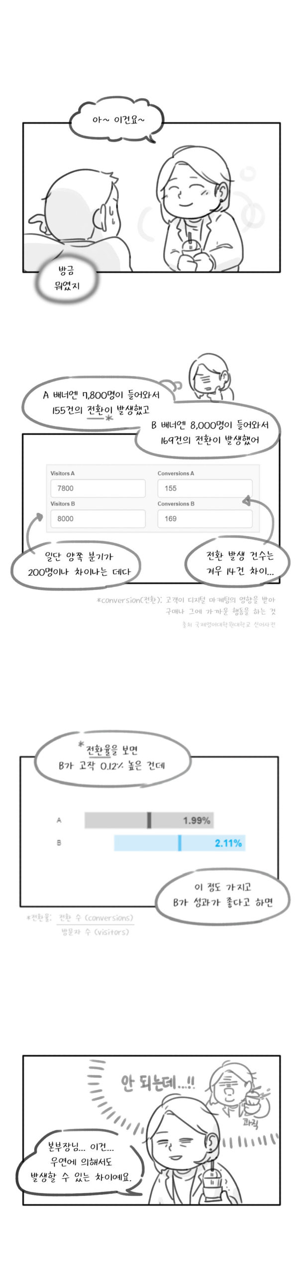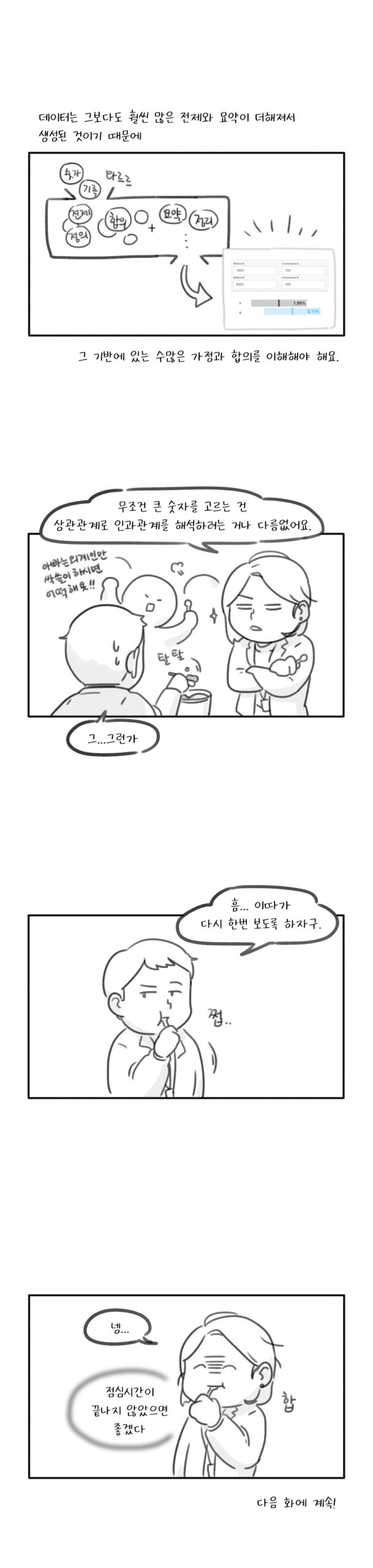 숫자 자체의 변화는 중요하고, 숫자 변화를 기반으로 한 판단은 명확한듯 보인다. 기술의 발달로 다양한 움직임을 세밀하게 측정하기 좋아졌고, 이를 활용하는 여러 방법도 고안되었다. A/B 테스트처럼 동 시간에 사용자를 나눠서 반응을 살펴보는 등의 다양한 실제 실험도 널리 사용되고 있다. 많은 기업에서 A/B 테스트를 활용해 서비스를 개선하고, 더 나은 이벤트 효과를 노린다. 간혹 옆 사람과 SNS 버튼이 다르고, 본인에게만 특정 쿠폰이 발급되는 경험을 해보았을 것이다. 이런 것이 A/B 테스트다. 그리고 우리가 의아해하며 사용한 내용은 데이터화되어, 데이터 분석가와 현업 부서 사람이 어느 쪽을 선택할지 비교하는 데 참고자료로 사용된다.