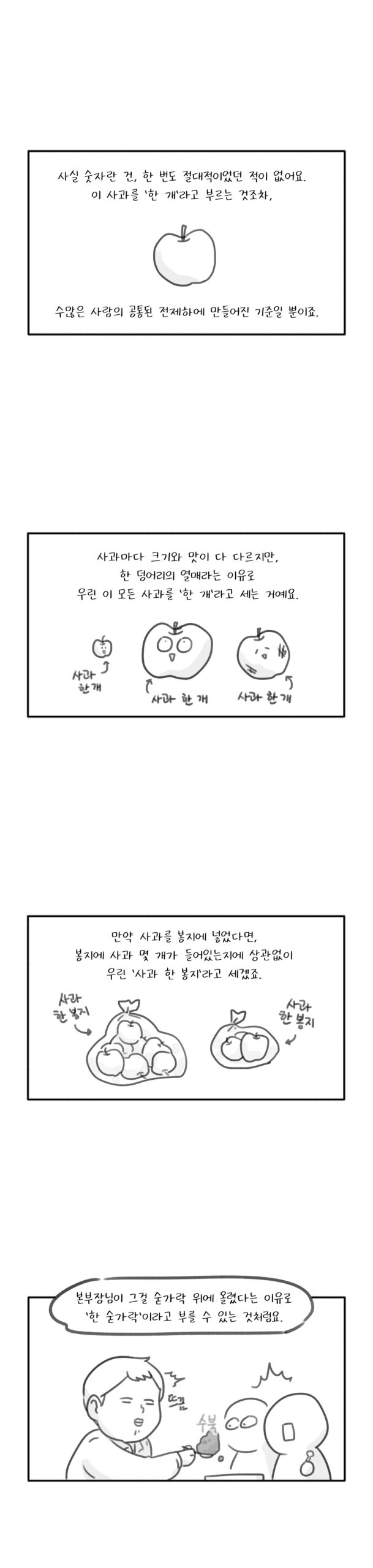 ‘숫자의 차이’는 절대적인 것처럼 보이는데, 이를 왜 ‘여러 면으로’ 고민해야 할까? 수학은 불확실성 위에 쌓아 올려진 학문이고, 통계는 항상 확률과 같이 등장하며, 숫자는 한 번도 절대적인 적이 없다. ‘사과 3개’라는 명확하다고 생각하는 숫자의 절대성도 사실은 수많은 사람의 공통된 전제하에 만들어진 기준이다. 우리는 사과 크기가 다 다르고, 맛도 다 다르지만 한 덩어리의 열매라는 이유로 ‘한 개’라고 센다. 만약 사과를 봉지에 넣었다면 사과 가 몇 개든 신경 쓰지 않고 ‘사과 한 봉지’라고 할 것이다. 이런 간단한 숫자 사용에도 이미 전제가 적용된다. 세상의 수치 비교는 수많은 전제를 논리적으로 배치했을 때 수학이나 통계의 가치가 빛을 발하게 한다.