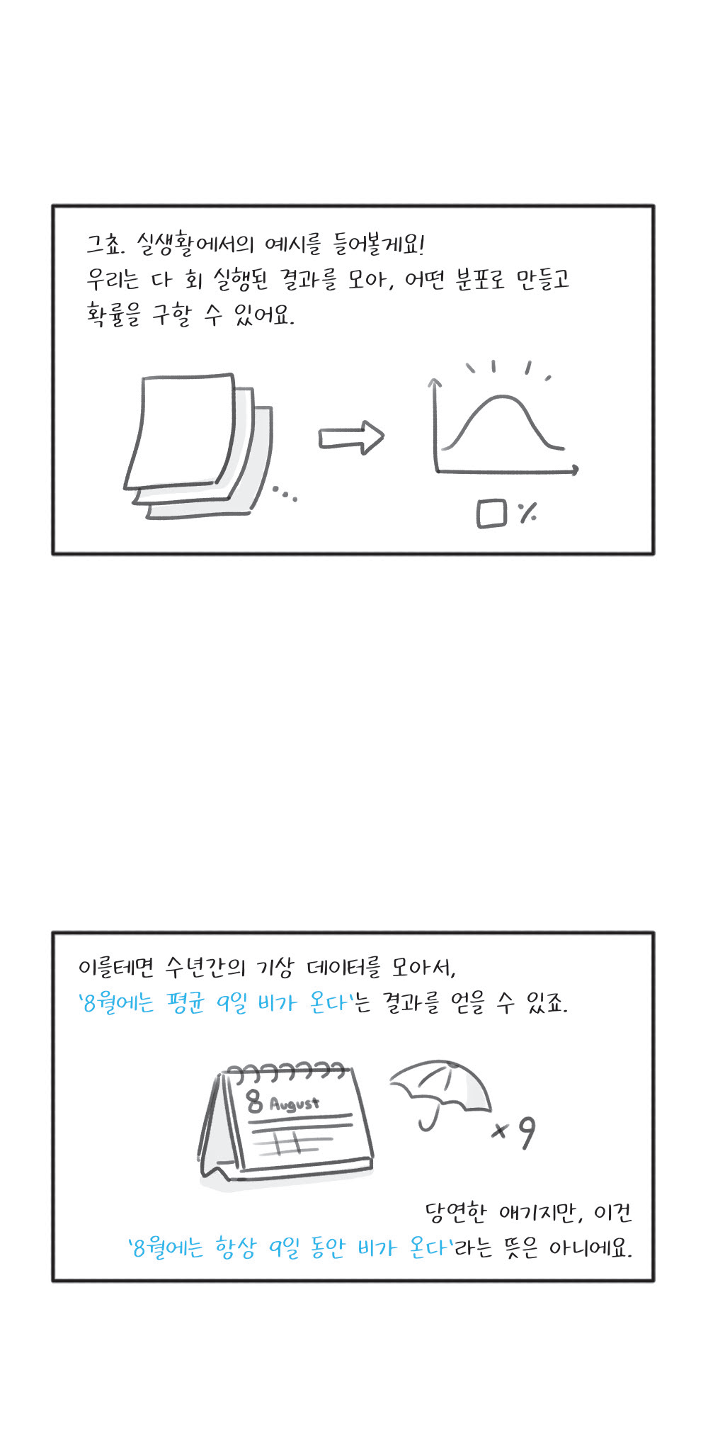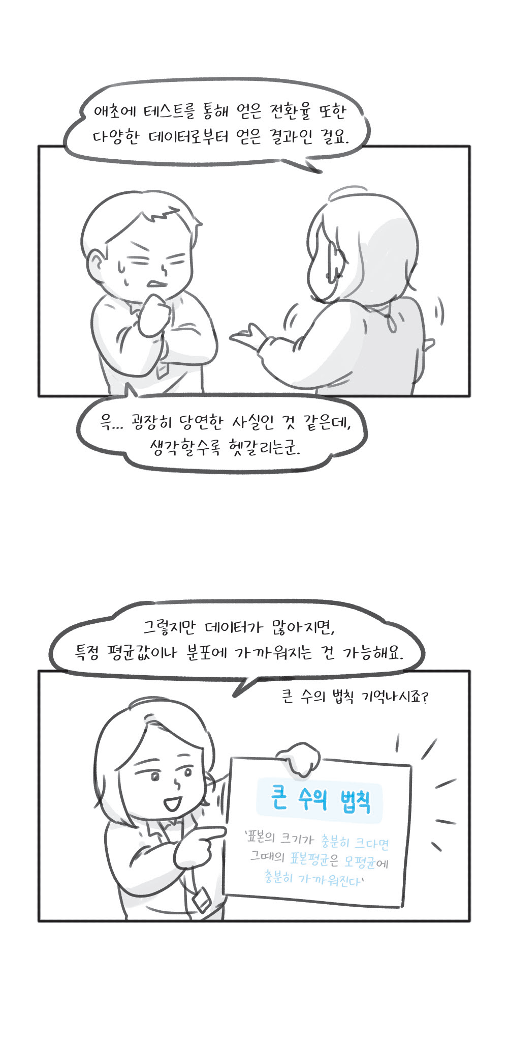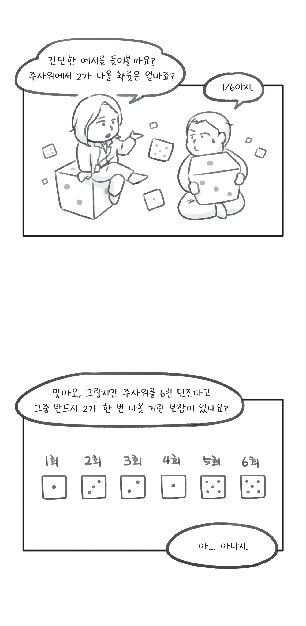 이는 실제 상황에서도 비슷하다. 그래서 동일한 환경에서 다회 실행된 결과를 모아 어떤 분포로 만들고 확률을 구해서, ‘이러이러할 확률은 대략 어느 정도 된다’라고 이야기한다. 수년간의 8월 기상 데이터를 모아서 ‘8월에는 평균 9일 비가 온다’라고 말할 수 있다. 기존 결과가 없는 상태에서 어떤 확률을 구할 때는 사건을 임의로 일으켜 데이터 집합을 만들기도 한다. 이런 용도로 사용되는 기법으로 A/B 테스트가 있다. 그래서 A와 B가 평균 10% 차이로 A가 더 높았고 대략 전환율이 3%라는 결과가 정말로 확실하다고 해도(실제 상황에서는 이미 환경이 동일하지 않을 여러 변수가 있지만 무시한다고 해도), 실제로는 전환율이 훨씬 낮게, 혹은 더 높게 나오는 날도 존재할 수 있다. 다만 아주 오래 이를 두고 보면, 수학자 베르누 이가 말한 ‘큰 수의 법칙’을 따라 그 비율은 3%에 가까워질 수 있을 것이 다. 확률은 지나간 사건의 결과를 보상해주지 않는다. 동전 앞면이 세 번 나왔다고 해도, 다음에 뒷면이 세 번 나오지는 않는다. 하지만 사건의 반복을 통해 쌓이는 데이터는, 흙탕물에 맑은 물을 붓는 것처럼 이런 불균형을 정돈할 힘을 가지고 있고, 많은 기록이 지나간 후에는 대략 동전 앞면이 50%, 뒷면이 50%에 가까워지 게 된다.