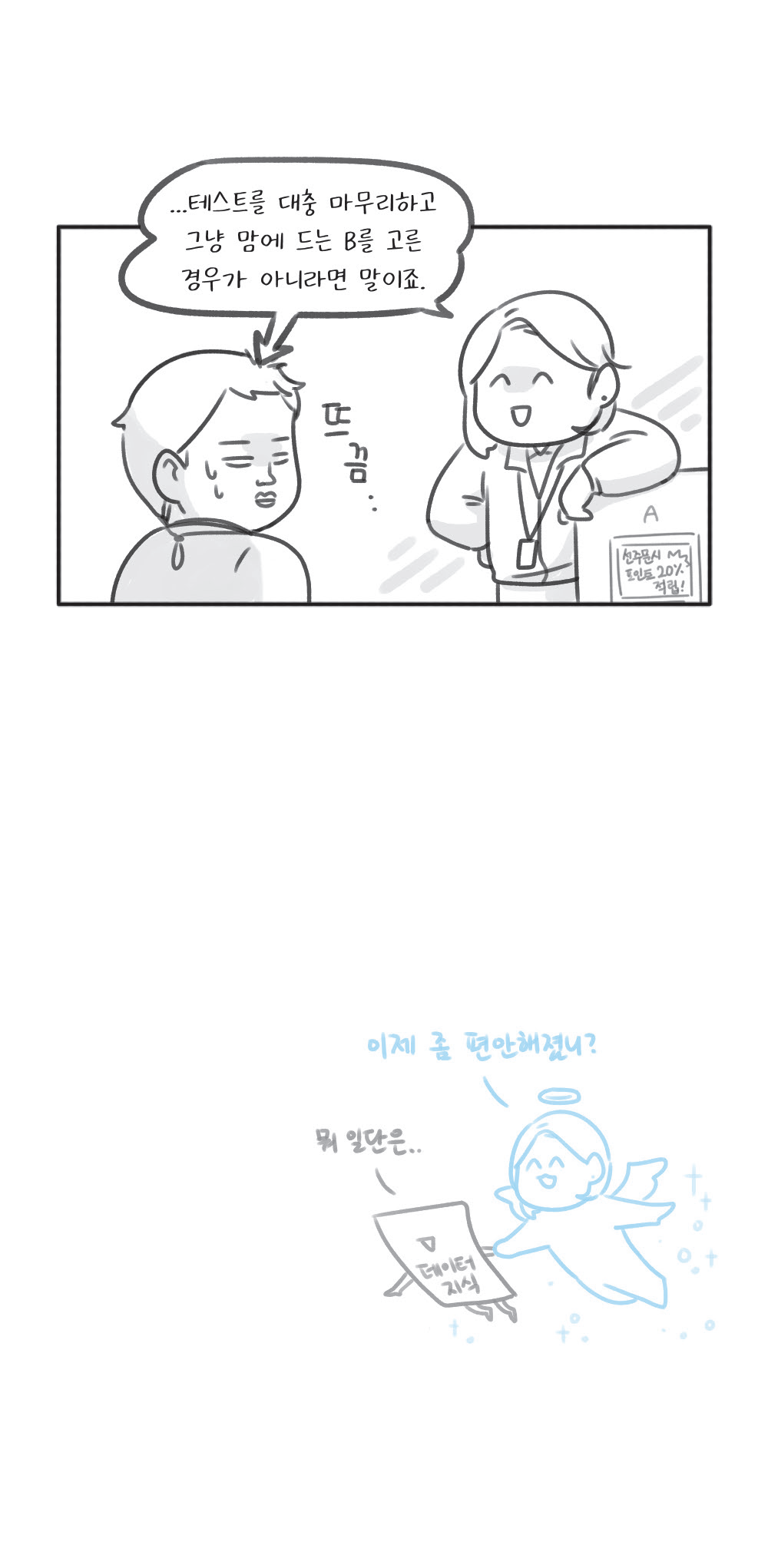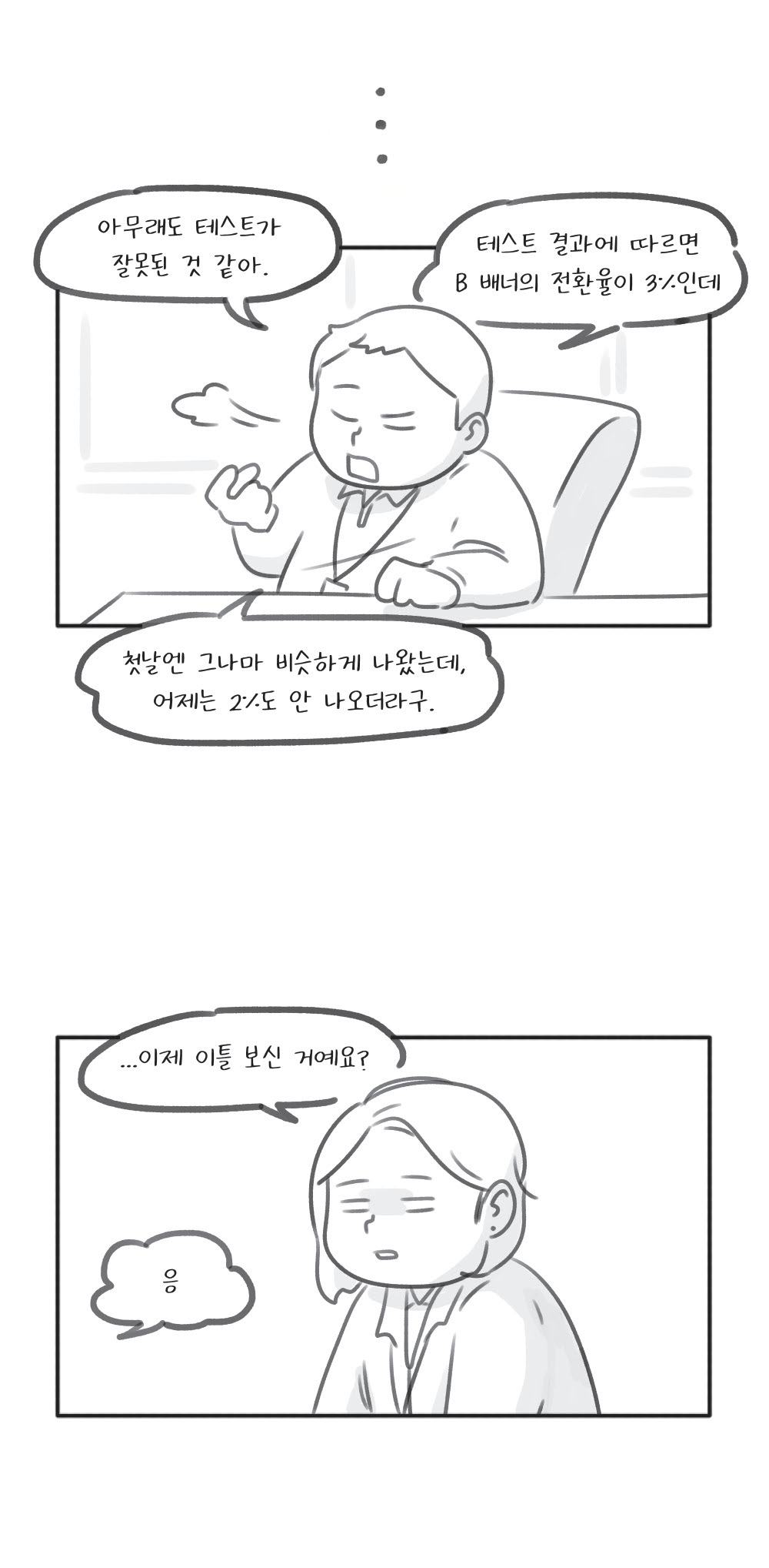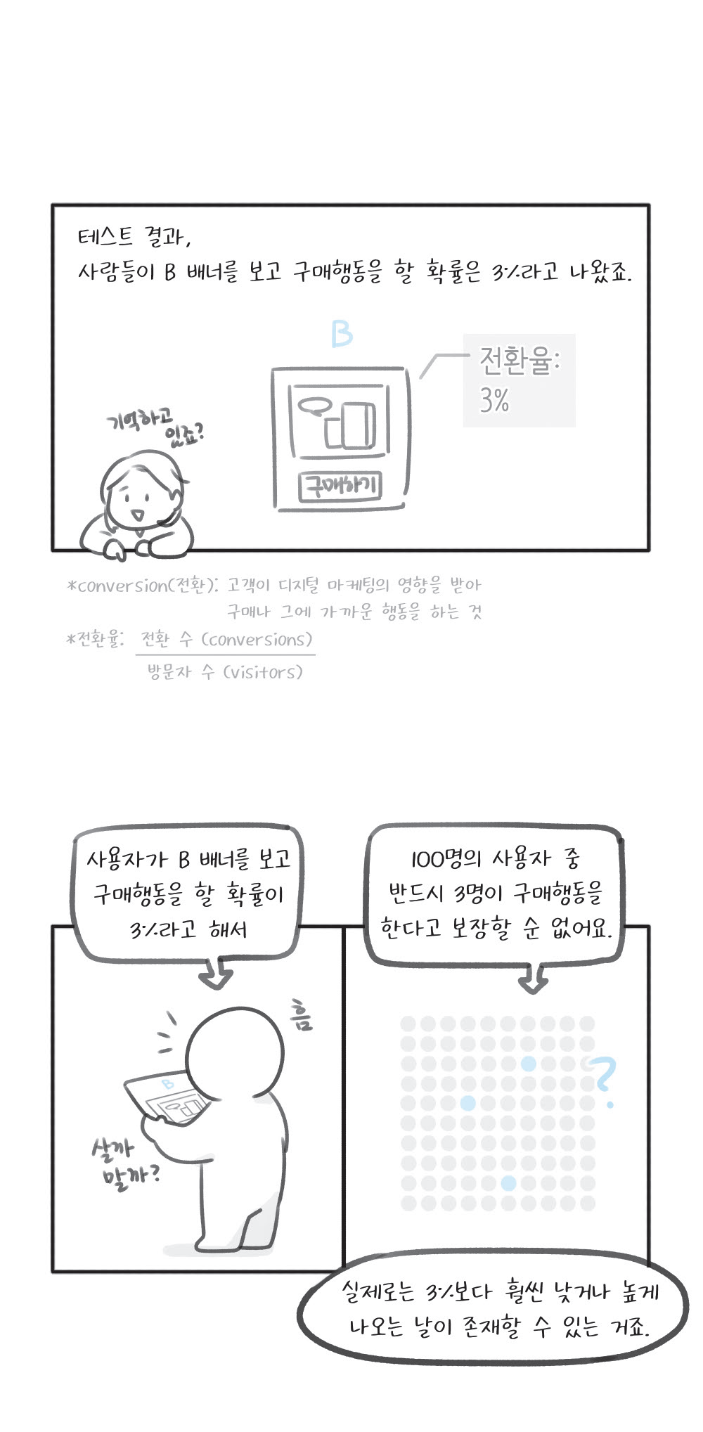 이는 실제 상황에서도 비슷하다. 그래서 동일한 환경에서 다회 실행된 결과를 모아 어떤 분포로 만들고 확률을 구해서, ‘이러이러할 확률은 대략 어느 정도 된다’라고 이야기한다. 수년간의 8월 기상 데이터를 모아서 ‘8월에는 평균 9일 비가 온다’라고 말할 수 있다. 기존 결과가 없는 상태에서 어떤 확률을 구할 때는 사건을 임의로 일으켜 데이터 집합을 만들기도 한다. 이런 용도로 사용되는 기법으로 A/B 테스트가 있다. 그래서 A와 B가 평균 10% 차이로 A가 더 높았고 대략 전환율이 3%라는 결과가 정말로 확실하다고 해도(실제 상황에서는 이미 환경이 동일하지 않을 여러 변수가 있지만 무시한다고 해도), 실제로는 전환율이 훨씬 낮게, 혹은 더 높게 나오는 날도 존재할 수 있다. 다만 아주 오래 이를 두고 보면, 수학자 베르누 이가 말한 ‘큰 수의 법칙’을 따라 그 비율은 3%에 가까워질 수 있을 것이 다. 확률은 지나간 사건의 결과를 보상해주지 않는다. 동전 앞면이 세 번 나왔다고 해도, 다음에 뒷면이 세 번 나오지는 않는다. 하지만 사건의 반복을 통해 쌓이는 데이터는, 흙탕물에 맑은 물을 붓는 것처럼 이런 불균형을 정돈할 힘을 가지고 있고, 많은 기록이 지나간 후에는 대략 동전 앞면이 50%, 뒷면이 50%에 가까워지 게 된다.