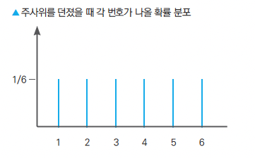 이때 시행 결괏값의 평균을 0과 1 사이로 나타낸 것을 ‘확률’이라고 하고, 확률이 어떤 모습으로 퍼져 있는지를 나타내는 것을 ‘분포’라고 한다. 분포의 모양새를 보고 특정 값이 얻어질 확률을 파악할 수 있다. 예를 들어 (아무런 장치가 되어 있지 않은) 주사위를 하나 굴릴 때 얻을 수 있는 값의 확률은 1부터 6 까지 동일하다. 주사위를 굴려 2가 나올 확률은 1/6이다. 이에 대한 확률 분포는 일종의 수평선을 그리는 형태로 나타난다. 아마도 열 번 주사위를 굴리면 1은 한 번, 2는 두 번, 3은 한 번... 식으로 나타날 수 있다. 하지만 수백 번 주사위를 던지면 각 값에 대한 확률은 대략 1/6에 가깝게 맞춰질 것이다.