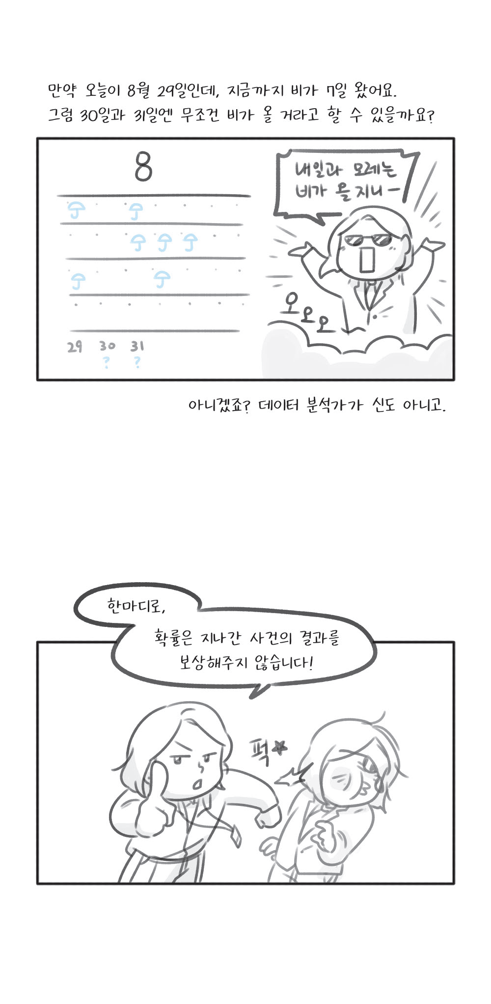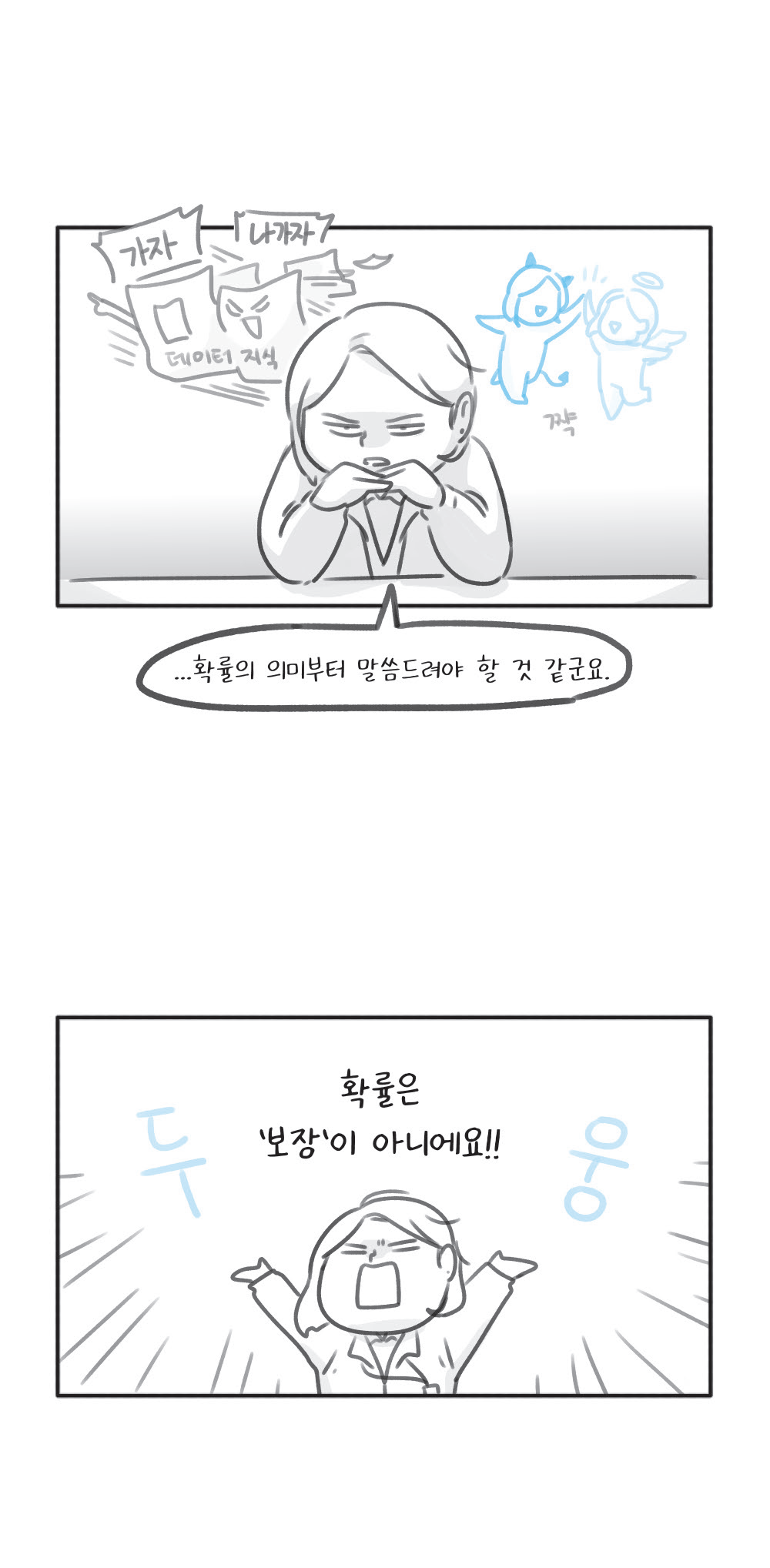 확률은 사람들의 삶 곳곳에 침투해 있다. 매일 아침 출근길에 하나씩 로또를 사며 로또가 당첨될 ‘확률’을 생각한다. 오늘 점심에 비가 올 ‘확률’을, 퇴근길에 지하철을 한 번에 탈 수 있을 ‘확률’을, 저녁에 집에 가서는 게임 가챠(뽑기 형태의 아이템)에서 좋은 카드를 뽑을 ‘확률’을 떠올린다. 그래서 우리는 확률에 매우 익숙하다. 오늘 비가 올까? ‘그럴 가능성이 높아보인다’. 오늘은 가챠로 한정 아이템이 나올까? ‘그럴 확률이 낮아 보인다’. 지구가 평평할까? ‘그럴 가능성은 지극히 낮지’라는 대답을 한다. 그리고 만약 비가 왔다면 ‘오늘은 일기예보가 맞네’라고 말한다. 이런 말은 결국 어떤 사건에 대한 가부를 묻는 형태가 된다.