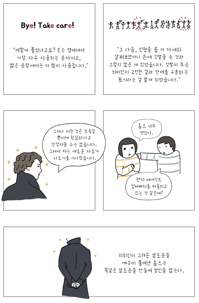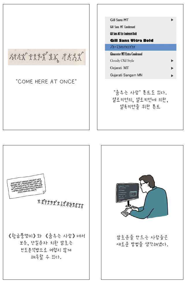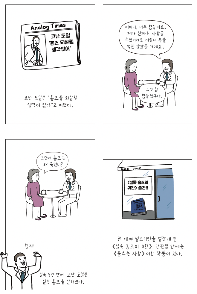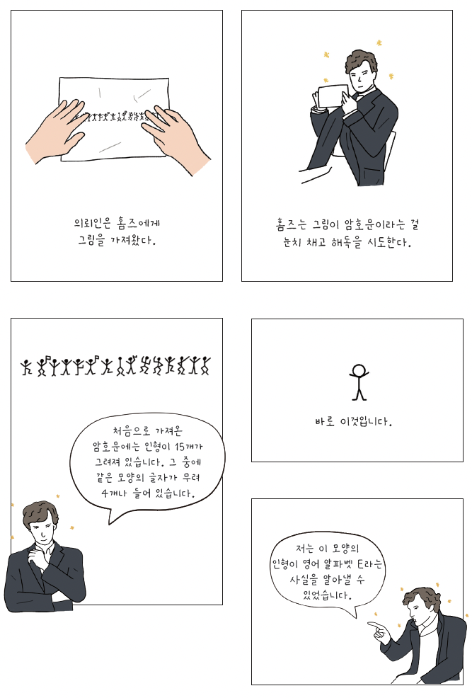《춤추는 사람 인형》의 풀이 방법은 앞서 소개한 에드거 앨런 포의 《황금풍뎅 이》와 거의 비슷하다. 코난 도일은 에드거 앨런 포를 좋아했고, 《황금 풍뎅이》 를 높게 평가했기 때문에 영향을 받았다고 볼 수밖에 없다. 《춤추는 사람 인형》에 나오는 그림 또한, 미국 아동 잡지에 나오는 수수께끼에 등장했던 그림이다. 잡지 출간 후 거의 30년 가량 지났을 무렵, 1903년 코난 도일이 한 호텔의 주인 아들에게 사인을 해줄 때, 아이가 춤추는 사람 인형으로 자신의 이름과 주소를 쓰는 것을 보고 소재의 영감을 얻었다고 한다.