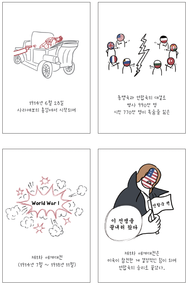 1914년 6월 28일 오스트리아-헝가리 제국의 황위 계승자와 그의 아내가 오스 트리아 땅인 사라예보에서 18살 세르비안인에게 암살된 사건이다. 이 사건을 도화선으로 오스트리아는 세르비아에 선전포고를 하고(7월 28일), 세르비아를 지원하던 러시아 또한 참전하기로 하고(7월 29일), 오스트리아와 동맹에 있 던 독일은 러시아에 선전포고를 한다(8월 1일). 각국 동맹국들의 참전이 이어지며 전쟁은 세계대전으로 겉잡을 수 없이 확장된다.