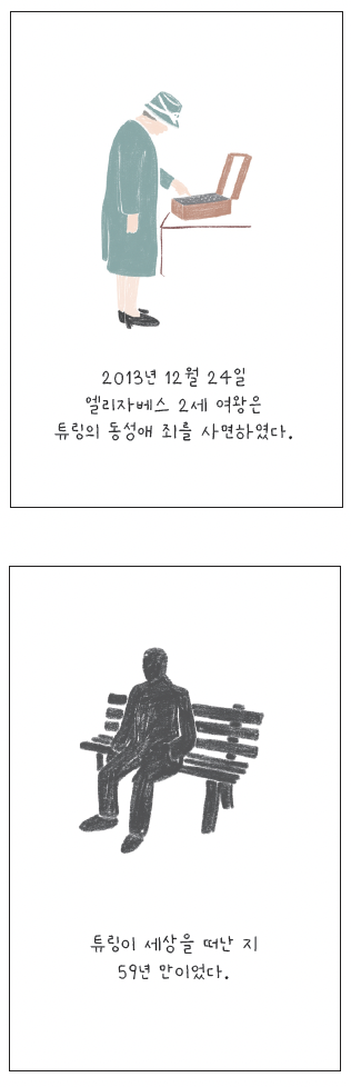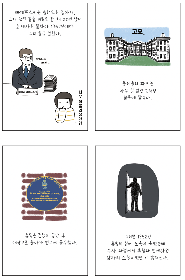앨런 튜링은 ‘튜링 테스트’를 고안하기도 했고, 컴퓨터 과학에 중요한 업적을 남 긴 사람들에게 매년 ‘튜링상'을 수여하고 있다. ‘컴퓨터 과학의 아버지’라고도 불린다. 그러나 튜링은 동성애 혐의로 체포되어 유죄 판결을 받았다. 1952년 영국에서 동성애는 범죄였다. 튜링은 감옥에 가는 대신 화학적 거세를 받았고, 2년 뒤인 1954년 사이안화 칼륨에 중독되어 사망했다. 자살이라는 설도 있으나 뚜렷한 근거는 없다. 시대가 바뀌어 튜링을 범죄자로 몰아넣었던 법 조항은 위헌 판결을 받아 사라졌고, 동성 결혼도 합법화되었다. 튜링은 2013년 12월 24일에야 사면 복권되 었다.