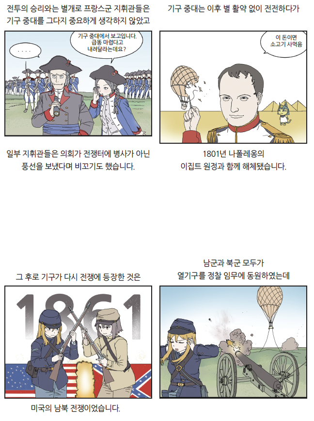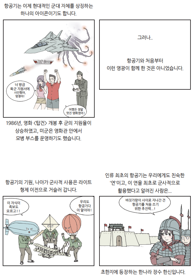 우리에게 전통놀이로 익숙한 연, 유유자적 하늘을 떠도는 기구는 무해 해 보이는 인상과 달리 군사적으로 쓰인 최초의 항공기였습니다. 연은 신호를 전달하는 통신 수단인 ‘신호연’으로 전쟁에서 사용되었습 니다. 군대는 지휘관의 명령을 전달하는 데 북과 깃발 등의 신호를 사용해 왔지만, 전장의 소음과 혼란 속에서 명령을 정확히 전달하는 것은 어려웠 지요. 반면 하늘 위를 나는 연은 직관적으로 병사들에게 명령을 전달할 수 있었지요.