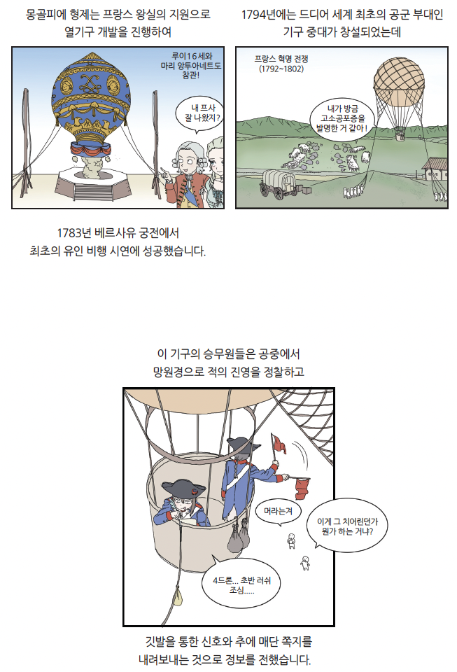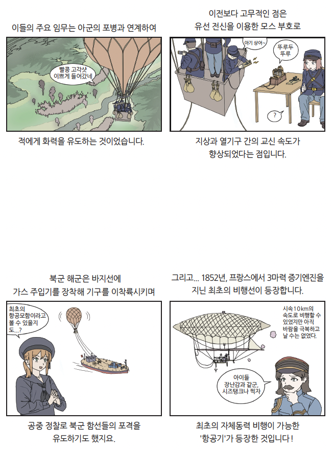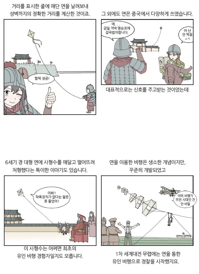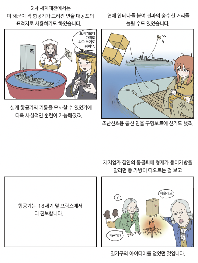 우리에게 전통놀이로 익숙한 연, 유유자적 하늘을 떠도는 기구는 무해 해 보이는 인상과 달리 군사적으로 쓰인 최초의 항공기였습니다. 연은 신호를 전달하는 통신 수단인 ‘신호연’으로 전쟁에서 사용되었습 니다. 군대는 지휘관의 명령을 전달하는 데 북과 깃발 등의 신호를 사용해 왔지만, 전장의 소음과 혼란 속에서 명령을 정확히 전달하는 것은 어려웠 지요. 반면 하늘 위를 나는 연은 직관적으로 병사들에게 명령을 전달할 수 있었지요.