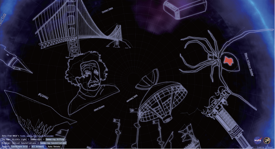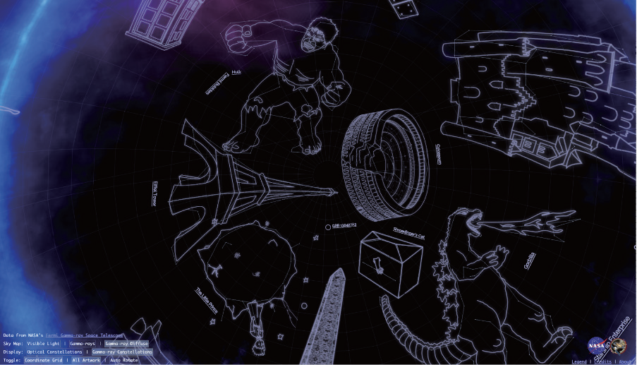 이것이 흥미로운 것은 별자리의 형태이다. 총 21개의 감마선 별자리는 현대에 정리 된 별자리답게 페르미 망원경 자리, 아인슈타인 자리, 세턴 V 로켓 자리, 슈뢰딩거의 상자 자리 등 과학과 관련되거나 에펠탑 자리, 콜로세움 자리, 후지산 자리, 오벨리스크 자리 같은 랜드마크 별자리도 있지만 어린 왕자 자리나, 묠니르 자리, 헐크 자리, 심지어 고질라 자리 등 문학이나 영화 등에 나오는 것을 별자리로 만들기도 했다.