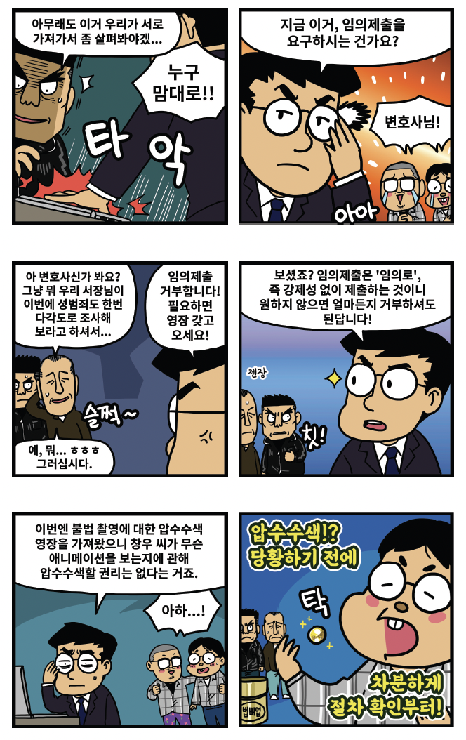 또 하나 주의해야 할 것은 어물쩍하게 ‘임의제출’을 해서는 안 된다는 것이다. 임의제출을 하는 순간 강제수사에 관한 많은 형사소송법 법규들 이 적용되지 않게 되는 불이익을 당하게 된다. 따라서 ‘좋은 게 좋은 거’라 는 말은 압수수색 현장에서는 생각하지 말아야 한다.